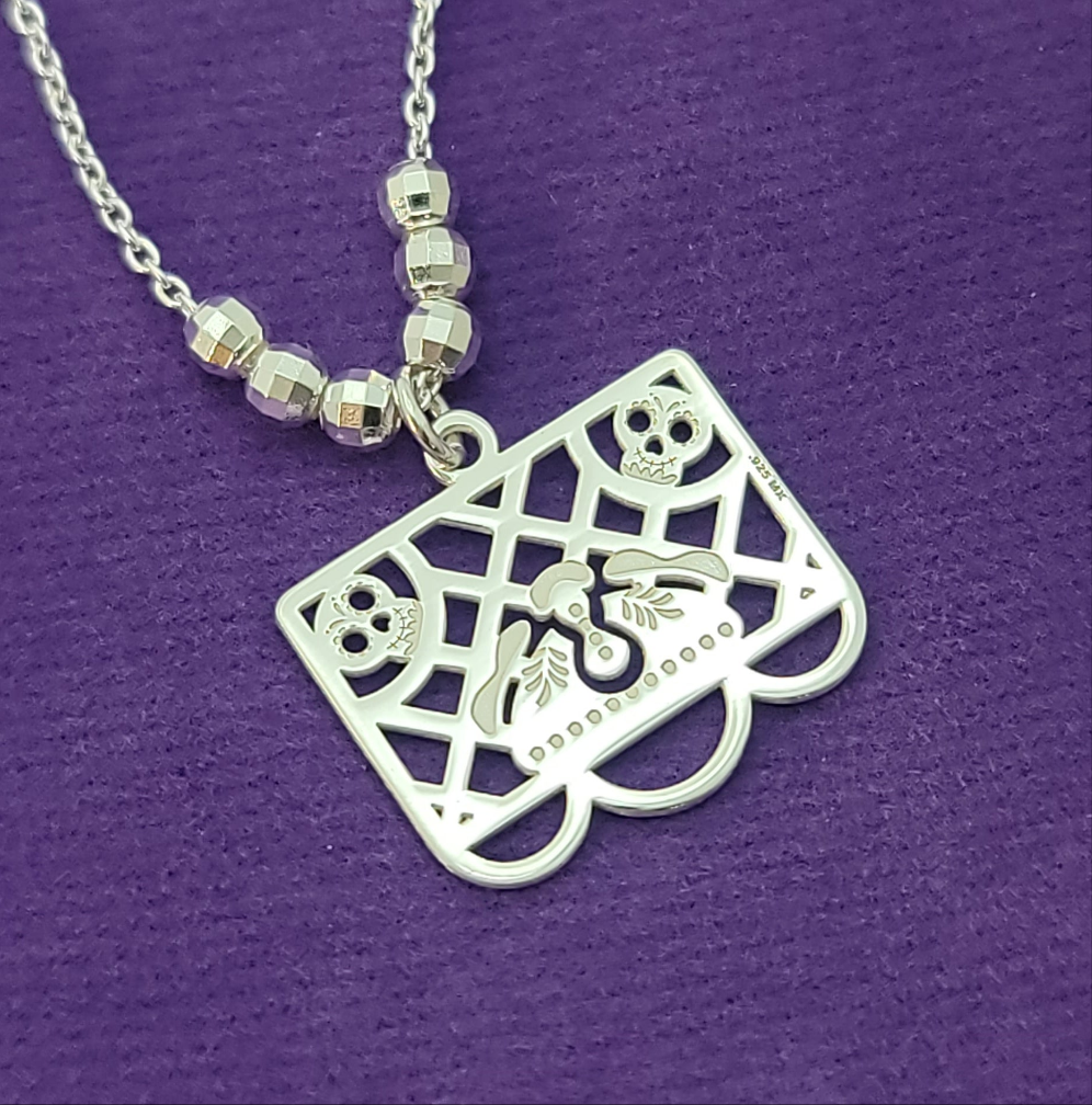 Collar de plata .925 con forma de papel picado y pan de muertos, muy tradicional.